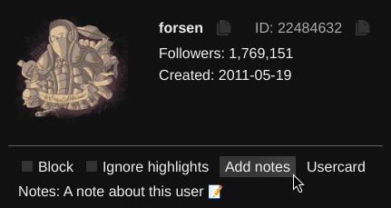 You can now add notes for a user in the usercard by clicking on the "Add notes" button. Notes are saved globally per user.